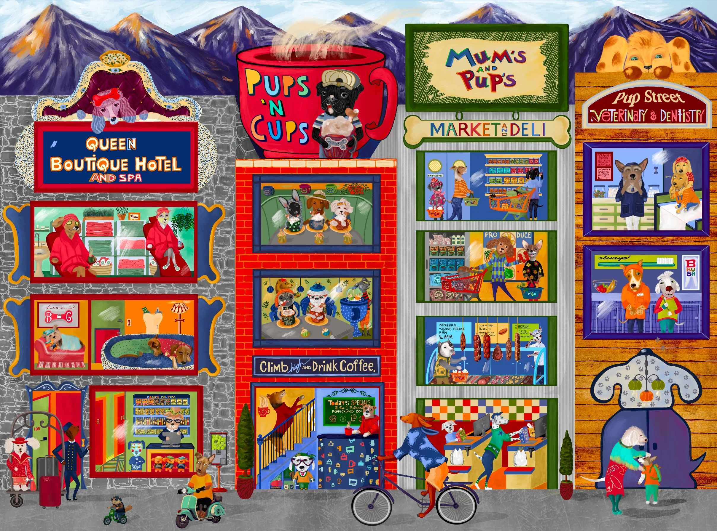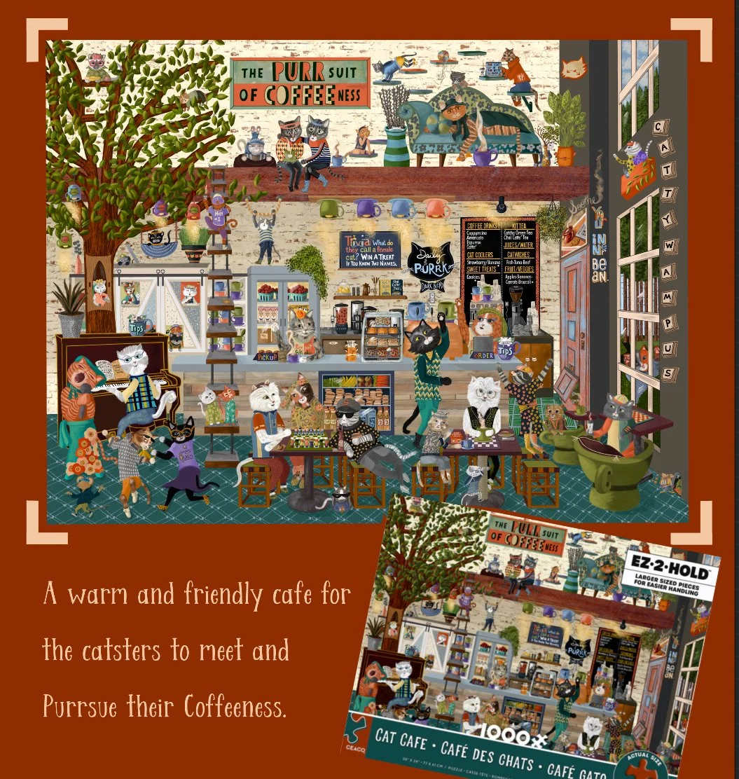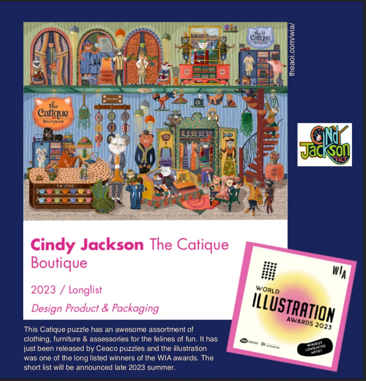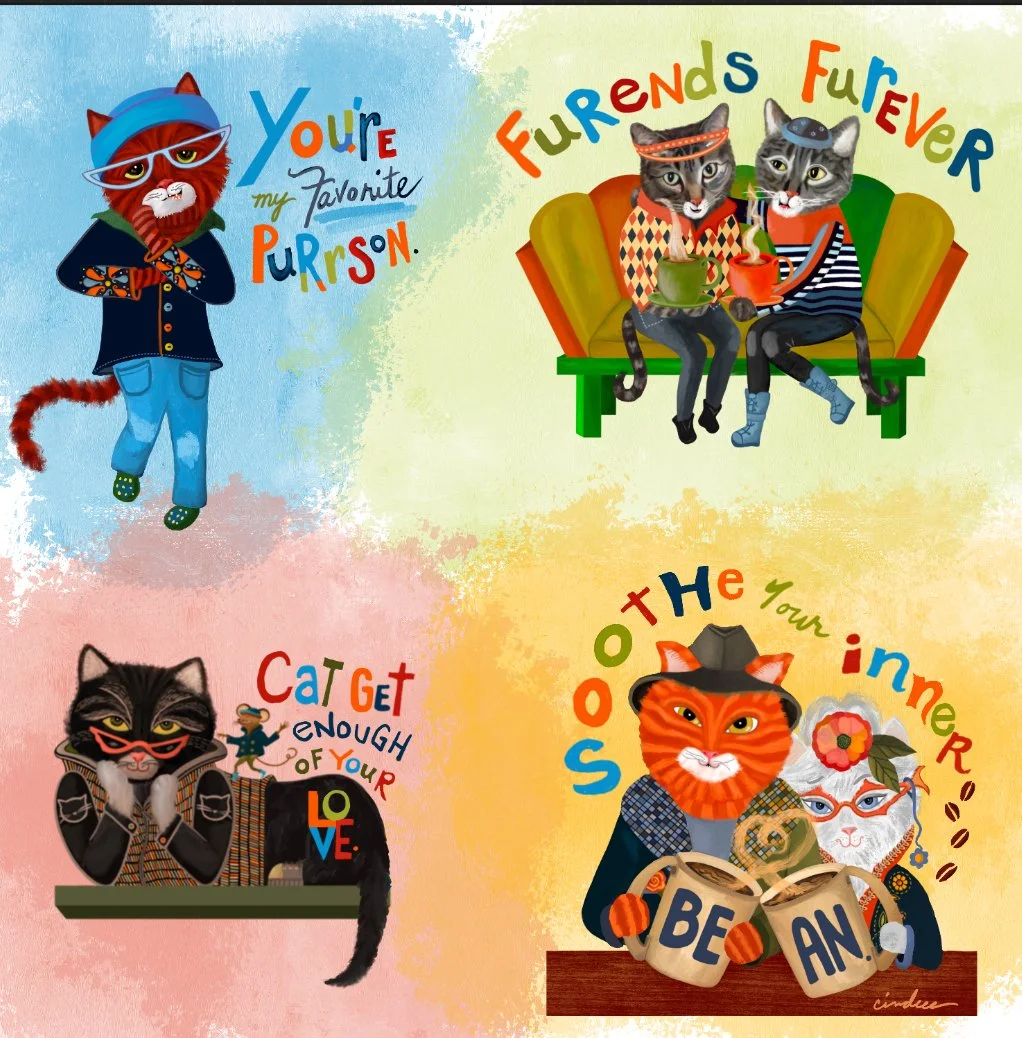 I currently have 5 puzzles licensed with one coming out this holiday season and 2 fabric collections. I am writing and illustrating an artsy book titled “The Purrrsuit of Happiness”. I’d love to create something for your company and you can contact me or my agent, Lisa Larsen Studio